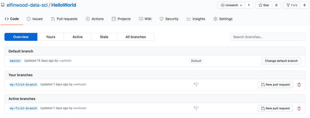 Note that deleting a branch locally will not delete it on the remote, instead you have to either delete the branch directly in GitHub (e.g., Delete branch button in Figure 11) or use a special line of code in the terminal. To delete my-first-branch locally enter the following code into the command line and hit Enter: