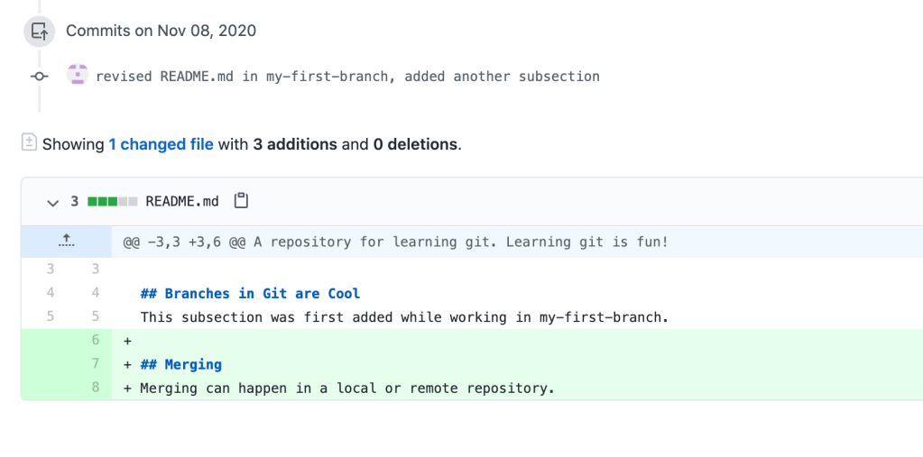 Now check README.md again. You’ll see the second section is there as in Figure 3. And finally, check the commit history again. You’ll see that the last commit is the one with the message “(HEAD -> my-first-branch, origin/my-first-branch) revised README.md in my-first-branch, added a subsection.” This illustrates that my-first-branch is a separate distinct workspace which has it’s own version of files and commit history.