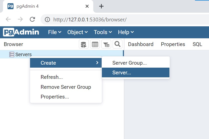 - Right click on Servers, and then click on Create and then select “Server…” (Figure 2, upper left)
