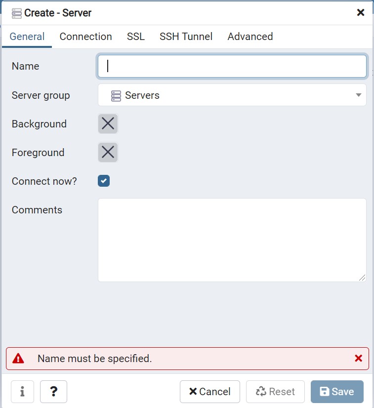 - In the “Create – Server” window on the “General” tab enter the following for the “Name”: learning_data_science