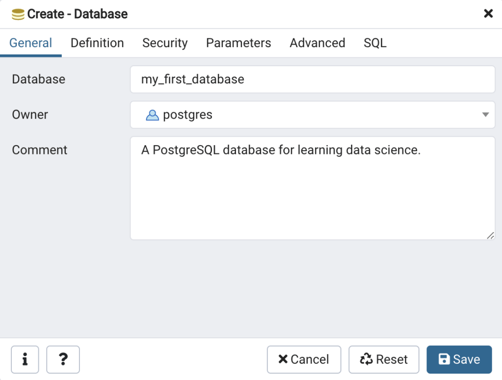 - Enter the Database name my_first_database, leave the owner as postgres, and enter the following into the “Comment” field: A PostgreSQL database for learning data science. The General tab should look like the left image in Figure 4.
