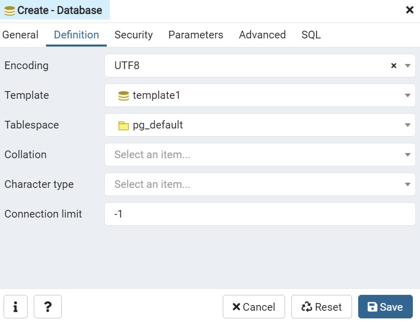 - Next click on the Definition tab and fill it out so that it looks like the center image in Figure 4. We are setting the character encoding to the default UTF8, we going to use template1 (the default, built in database template), and tablespace pg_default. The default connection limit of -1 means that an unlimited number of connections can be made to the database. *Note that UTF8 character encoding supports most spoken languages. You can check if your language is supported here: http://www.unicode.org/standard/supported.html