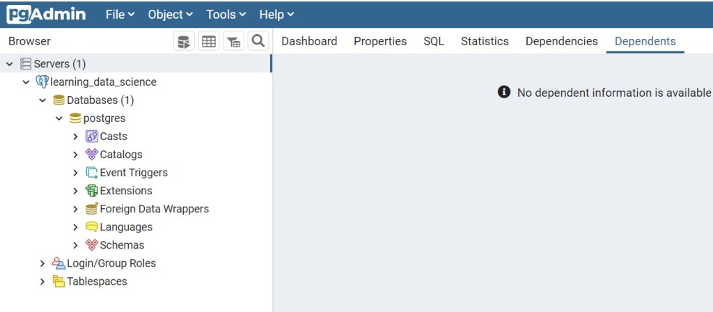 In this post, we installed pgAdmin and PostgreSQL, and created a database. In the next post, I’ll discuss database schemas and use the files in the Lesson_001 folder of the learning-data-science repository to create a new schema in my_first_database.