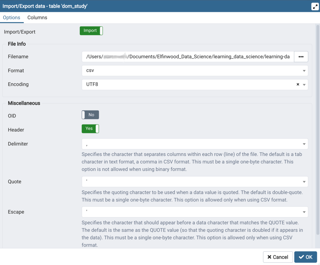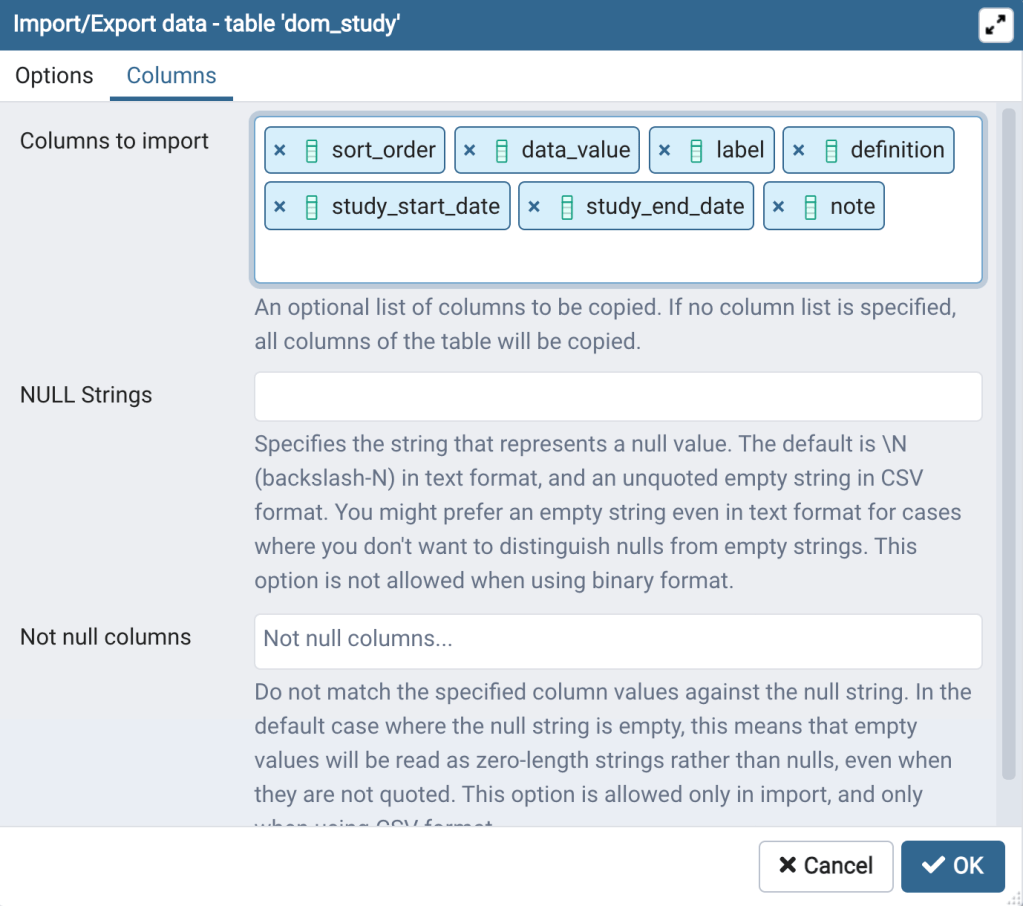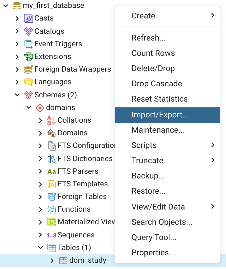 - In pgAdmin right click on the dom_study table and then click on “Import/Export…” (Figure 6). The Import/Export tool dialog will open (Figure 7, bottom).