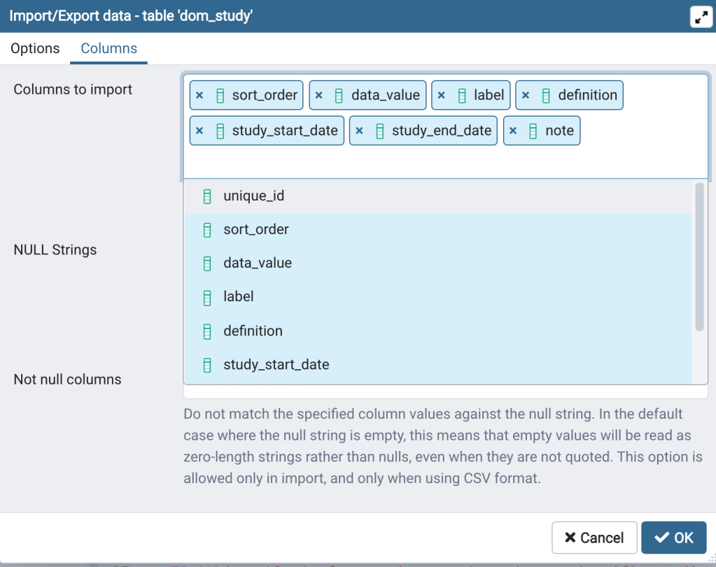 - Now click on white space in the “Columns to Import” cell. You will see a drop down with a list of the column names in the dom_study table (Figure 7, upper center). If you wanted to list the columns in a custom order you could remove all the columns, as we did above for unique_id, and then add them from this list in the order you choose. However, the columns are already in the same order as the data values in the CSV file, so we won’t make any changes here. Click outside the “Columns to Import” cell to close the dropdown (Figure 7, upper right).