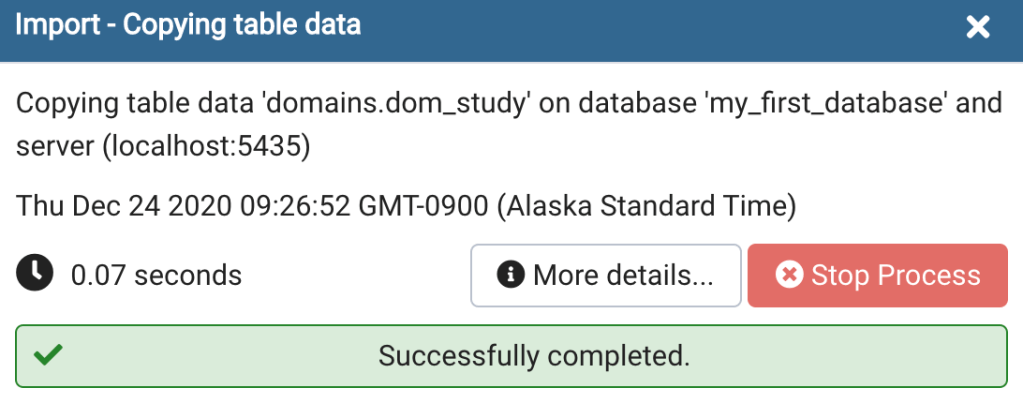 In this post, we inserted data into the dom_study table using an INSERT script and importing from a CSV file. We also learned 2 different methods to delete rows from a table. In the next post we’ll create 2 new tables, insert data into the tables, and create a foreign key constraint.