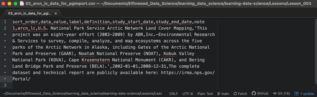 Open your text editor of choice, click on the open file tool, navigate to the clone of your fork of the learning-data-science repository, and then open the arcn_lc_data_for_pgimport.csv file (Figure 5). Let’s briefly inspect this CSV file. The first line is the header row, the second line is the row of data to insert. This is a comma separated values (CSV) file, thus the values are comma delimited. Therefore, for the import to work correctly, if any of the values contain commas, then those values must be enclosed in quotes to escape the commas within the values. Otherwise PostgreSQL will interpret the commas within the values as delimiters and will throw an error. This is because the number of data values interpreted by PostgreSQL won’t match the number of columns you are attempting to import data into. In this case single quotes are used on the definition value (i.e. ‘This project was an eight-year effort…’). However, double quotes would work just as well.