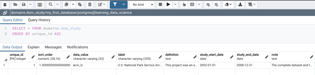 Now, open the dom_study table in View/Edit Data mode. You should see the row of data that we just imported. Congratulations! You just inserted your first row of data into a PostgreSQL table!
