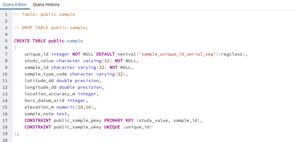 To create the sample table follow the steps provided in Lesson 002: Creating Tables in PostgreSQL using the files 01_create_seq_public_sample_uid_serial_seq.sql and 02_create_table_public_sample.sql located in the Lesson_004 folder of the clone of your fork of the learning-data-science repository. The first file creates a sequence to use in the unique_id field in the sample table, run this file first. Next, run the second file, which will create the sample table in the public schema. Let’s take a closer look at the code that creates the sample table (Figure 3).