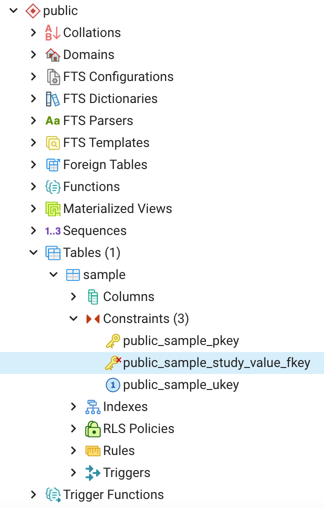 To create the foreign key, open the 03_create_public_sample_study_value_fkey.sql script in pgAdmin and run it. This will create the public_sample_study_value_fkey. To see this foreign key in pgAdmin, in the tree on the left, click on the public schema, then “Tables”, then “sample”, and finally “Constraints ” (Figure 4). Here we can see all the constraints on the sample table, including those that we created in past blog posts. Let’s now examine the script used to create the study_value foreign key (Figure 5)