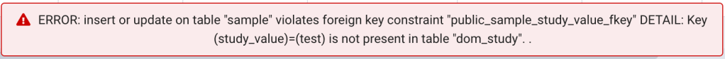 In this case we have set these both to NO ACTION, which is the default, and means that if a violation occurs then the database will not perform the action and will instead produce an error message (Figure 6). What do we mean by a “violation”. One example of a violation would be if you attempted to enter a value into the public.sample.study_value column that is not in the domains.dom_study.data_value column. This is illustrated in Figure 6 which shows the error message that resulted when I attempted to update the public.sample.study_value column with the value ‘test’ which, you’ll recall from lesson 003, is not present in the domains.dom_study.data_value column. Lastly, the comment on the constraint provides a short description of the constraint and this description will be stored in the database as metadata.