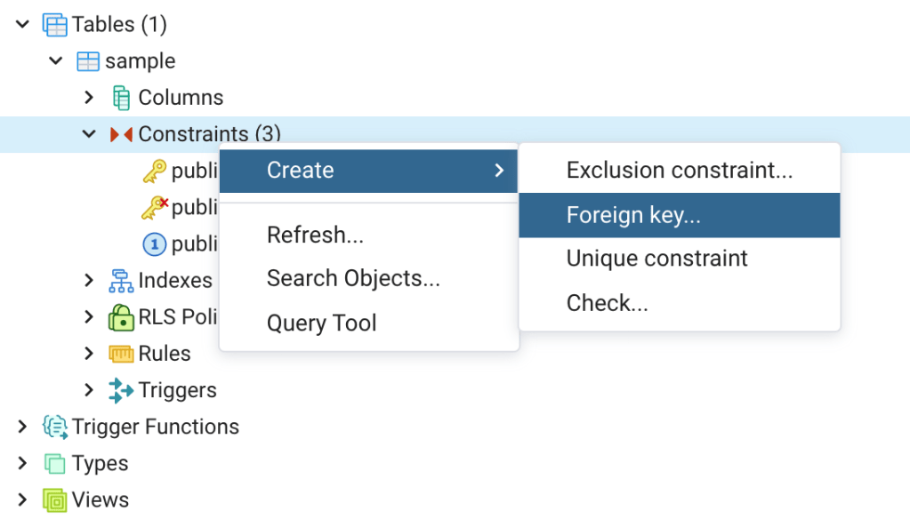 In addition to using a SQL script to create a foreign key, pgAdmin provides a tool to perform this task. To use the tool, first navigate to the sample table in the pgAdmin tree and click on it. Then right click on “Constraints” and then click on “Create” (Figure 8).