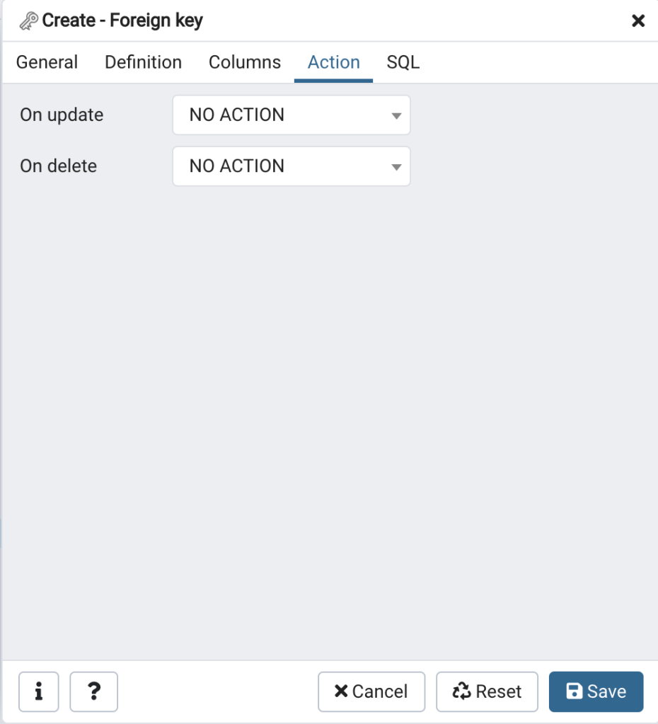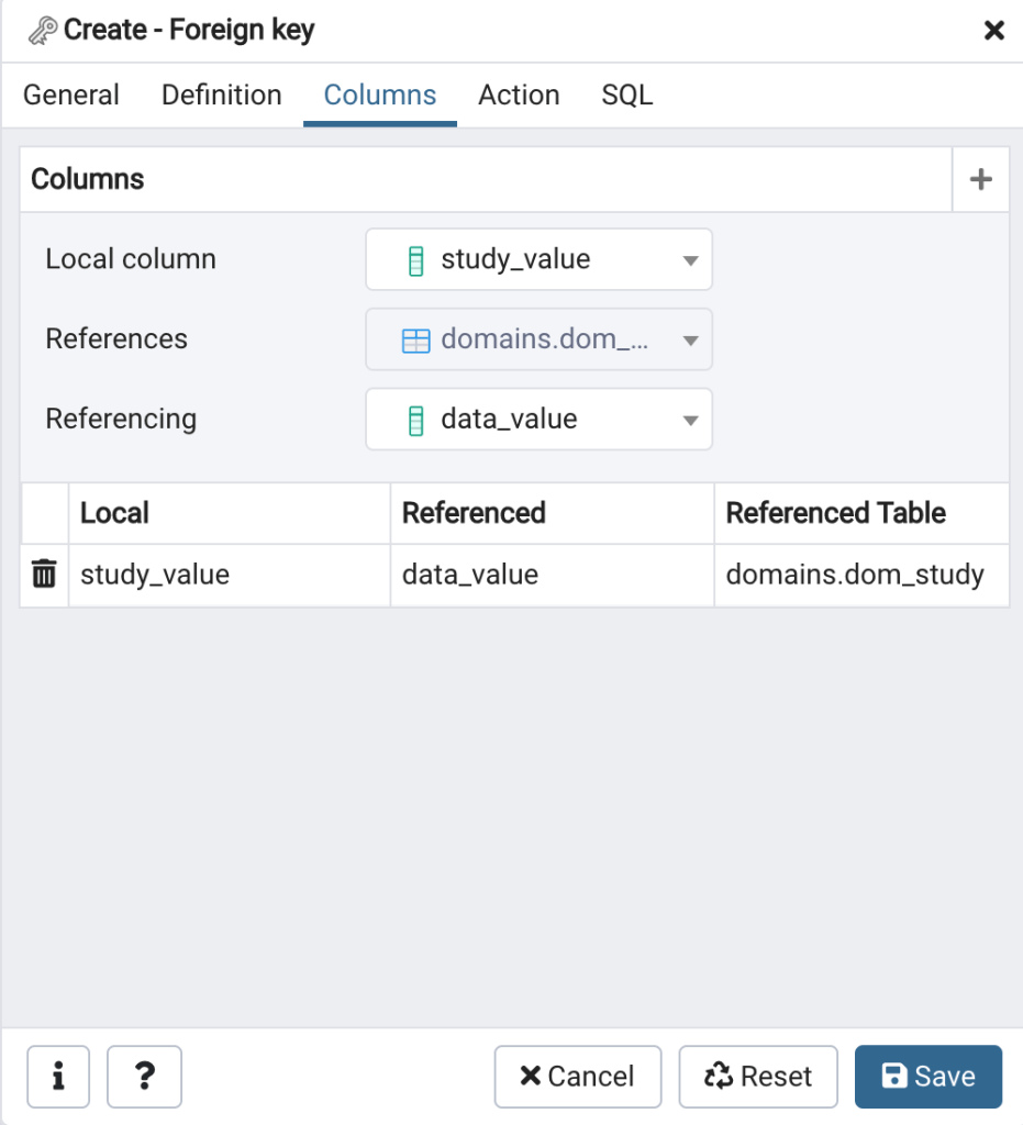 This is where you select the “local” column, i.e., the column in the table for which you want to create the foreign key, and the referenced table and column. In this case the local column is study_value, the referenced table is the domains.dom_study table, and the referenced column is data_value. Once you’ve selected the column click on the + icon in the upper right to add the columns to the key. The Action tab (Figure 9 lower left) is where you can select what should happen if the foreign key is violated. The default is NO ACTION which we’ll accept here. Lastly, click on the SQL tab; you’ll see that the tool is building a SQL script based on your selections. You can use this as a learning tool, or copy out the SQL and run it in the Query Tool to create the foreign key. To use the tool to create the foreign key simply click on the Save button in the lower right.