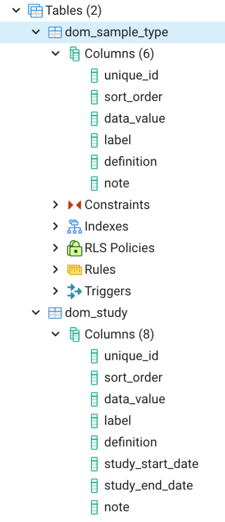 Take a look at the columns in the domains.dom_sample_type table, and compare them to the columns in the domains.dom_study table (Figure 10). You’ll notice that the columns are very similar to those in the domains.dom_study table. This is because we’ve adopted a standardized column format for our domain table that always includes the following fields: unique_id, sort_order, data_value, label, definition, and note. This standardized format will make it easier to manage and use the domain tables in the future.