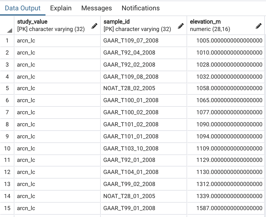 To return a specific subset of columns from a table, list the columns of interest in the order in which you want them to be returned. For instance, the following will return three columns, study_value, sample_id, and elevation_m, and all rows from the public.sample table.