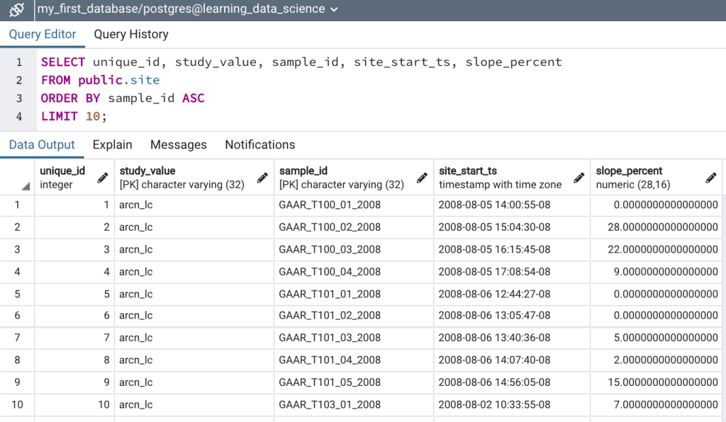 Note that in the above select statement the results are ordered by the sample_id column and 10 rows are specified in the LIMIT clause. The query will first sort the table by sample_id in ascending order and then will return the first 10 plots based on the alphabetical order of sample_id (Figure 1a). However, let’s say that you’re interested in seeing the first ten plots that were sampled based on the start time. To do this the results need to be returned in chronological order from earliest to latest (i.e. ascending order) based on the site_start_ts field. To do so simply order the results by site_start_ts as follows: