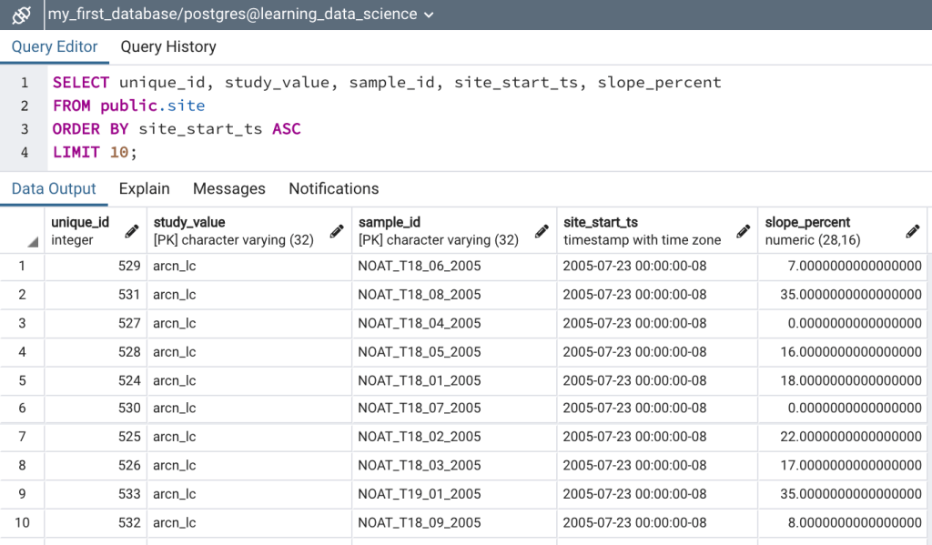 See Figure 1c for the results of the above query. Note that in the above select statement that the results are also ordered by sample_id in ascending order. This was included to specify how to handle the ordering of the results in the event that more than one plot has the same slope_percent value.