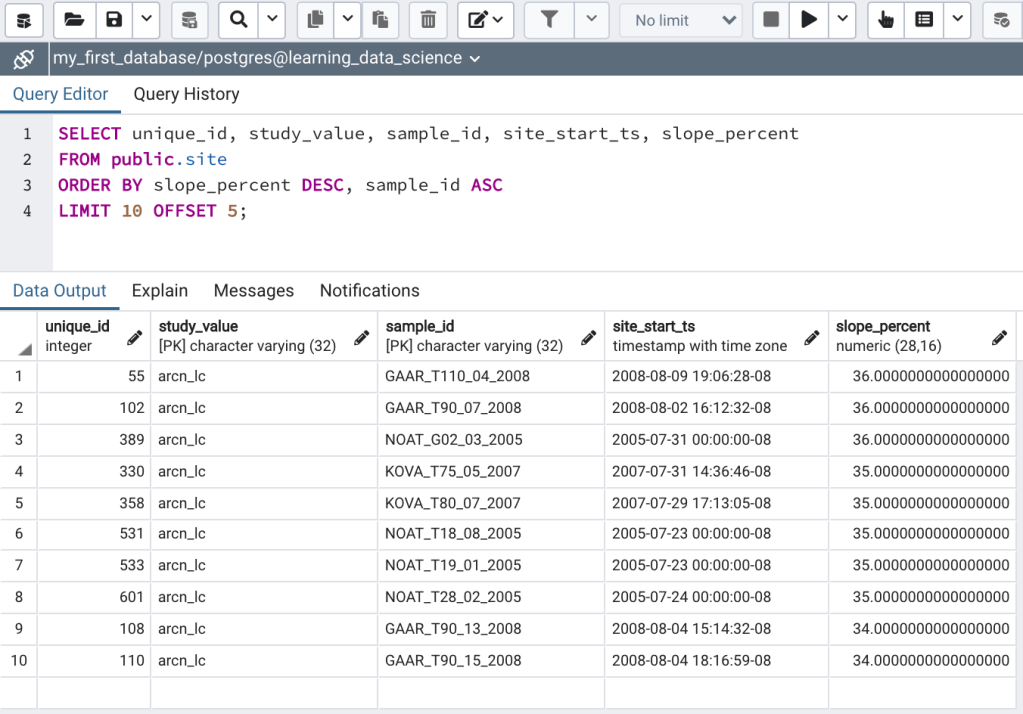 OFFSET is used with LIMIT to specify the number of rows that are skipped before the LIMIT clause takes effect. For instance, the following select statement will return 10 rows starting from the 6th row (i.e., the first 5 rows are skipped) ordered by slope_percent (Figure 2):