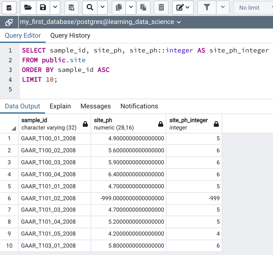 SELECT sample_id, site_ph, site_ph::integer AS site_ph_integer