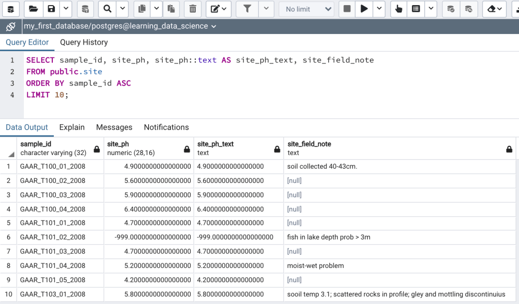 SELECT sample_id, site_ph, site_ph::text AS site_ph_text, site_field_note