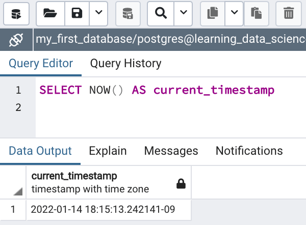 In the above statement I created a timestamp with time zone column called “current_timestamp” using the NOW() function (Figure 5b). I’ll cover PostgreSQL date/time functions in more detail in a future post.