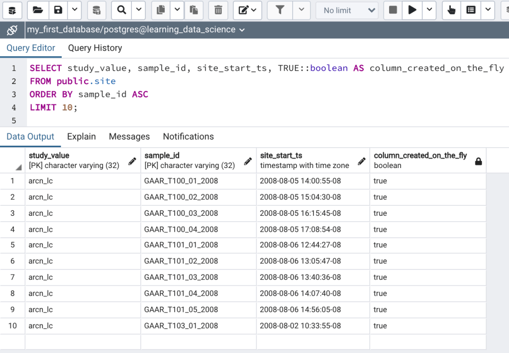 In the above statement I select several columns from the public.site table and created a boolean column called “column_created_on_the_fly” and assigned the value TRUE (Figure 5c). Notice that the value in the “column_created_on_the_fly” column is repeated for all of the rows returned.