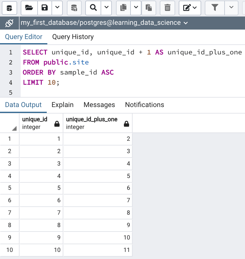 The addition is performed on each row. Notice in the results (Figure 6a) that the data type of the new column is integer, the same as the original unique_id column, this is because the result of integer addition is an integer and PostgreSQL intuits this.