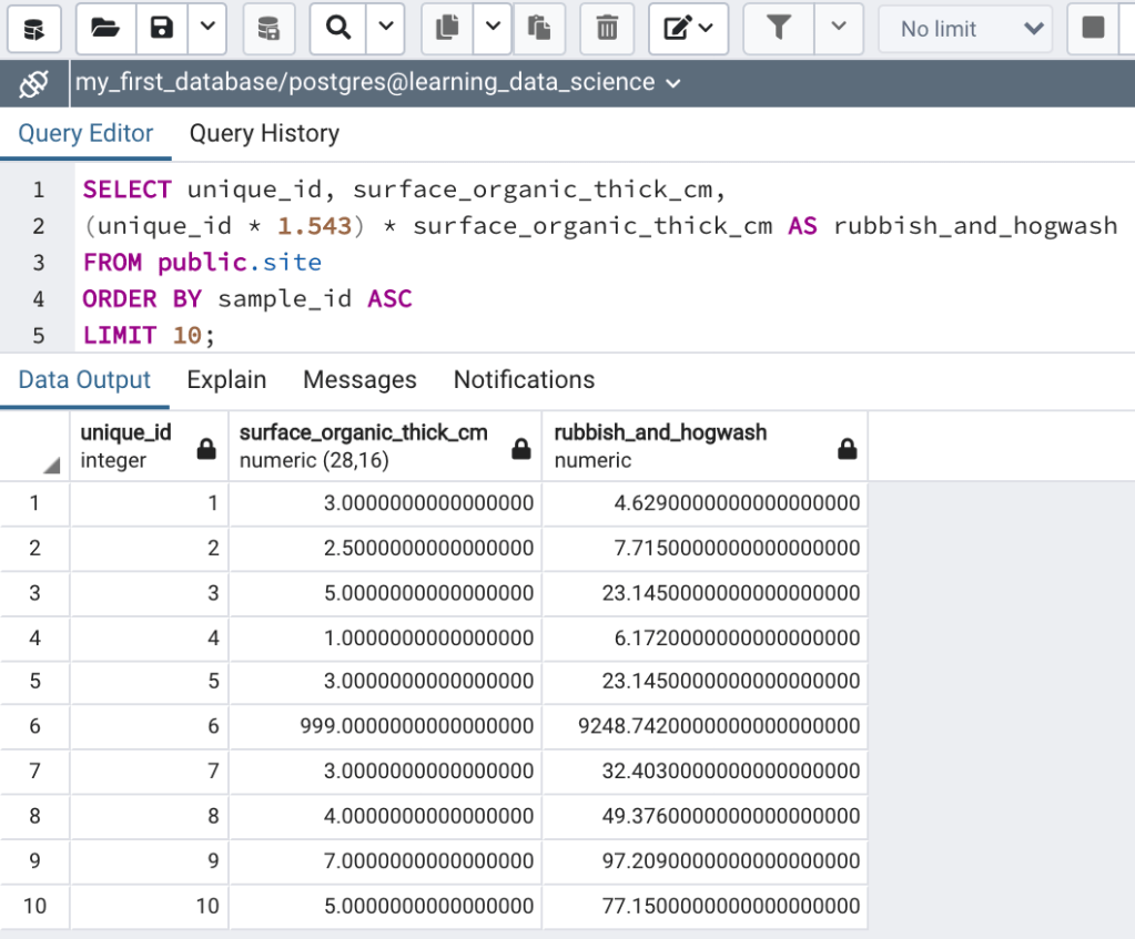 In the above select statement I’ve multiplied unique_id by 1.543 and multiplied the product of that operation by the surface_organic_thick_cm column and the results are returned in a new column called “rubbish_and_hogwash”. The results of this operation are meaningless outside of this example, hence the humorous column name.