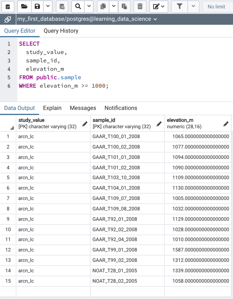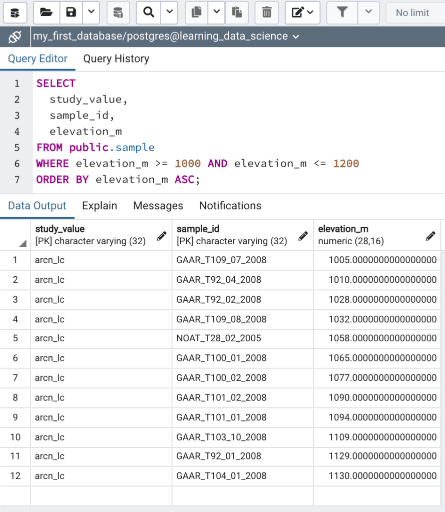 The above select statement will return the rows in public.sample with an elevation_m greater than or equal to 1000 meters and less than or equal to 1200 meters and sorted in ascending order by elevation_m (Figure 1C). The above boolean expression can be expressed in mathematical notation as 1000 ≤ elevation_m ≤ 1200.