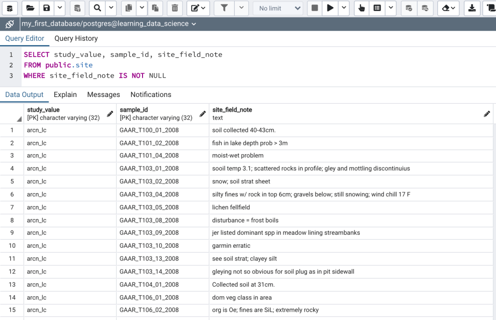 The following select statement provides an example of using the IS NOT NULL predicate to return only those rows in the public.site table for which a site_field_note exists, i.e., rows for which the site_field_note column is not null (Figure 2).