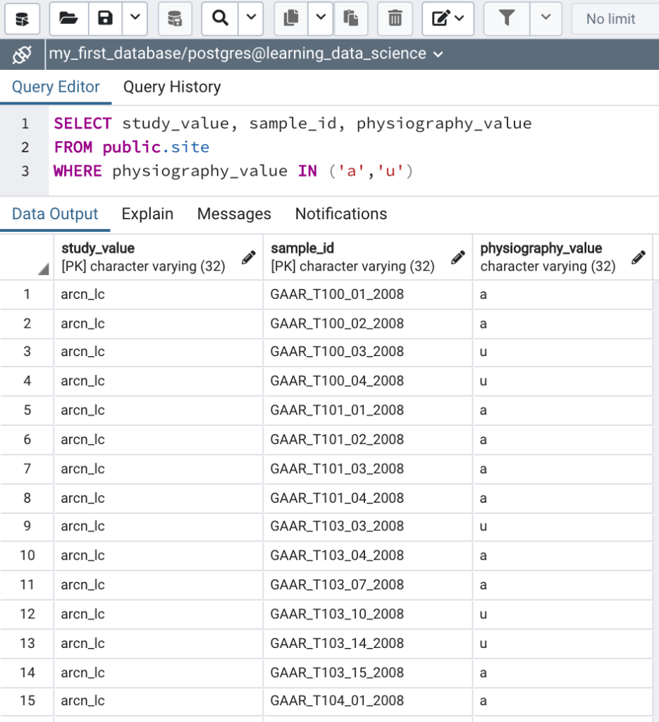 The above select statement will return the rows in the public.site table for which the physiography_value column is equal to either a or u (Figure 3A).