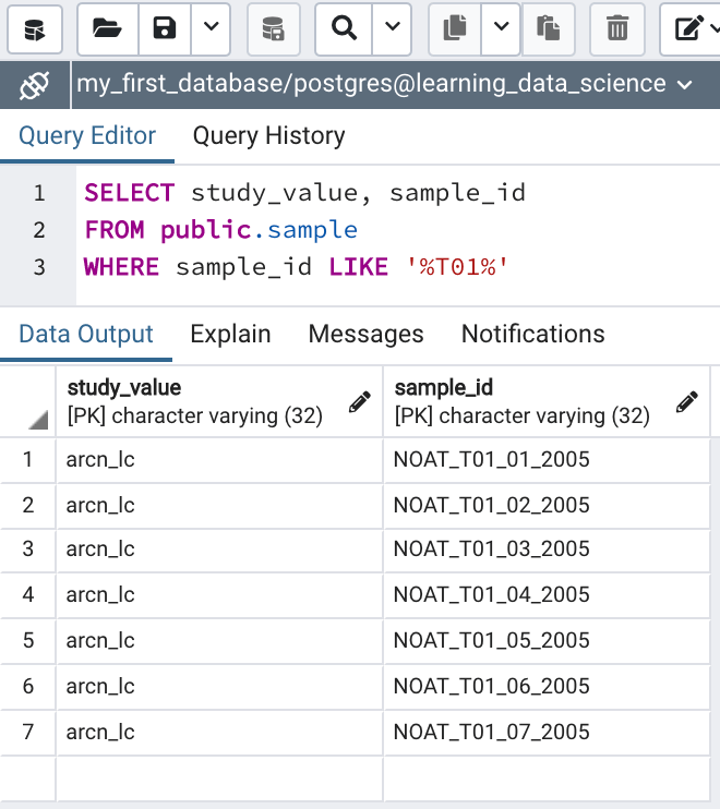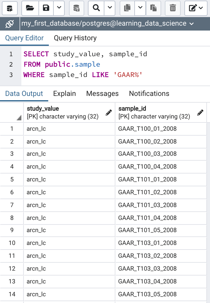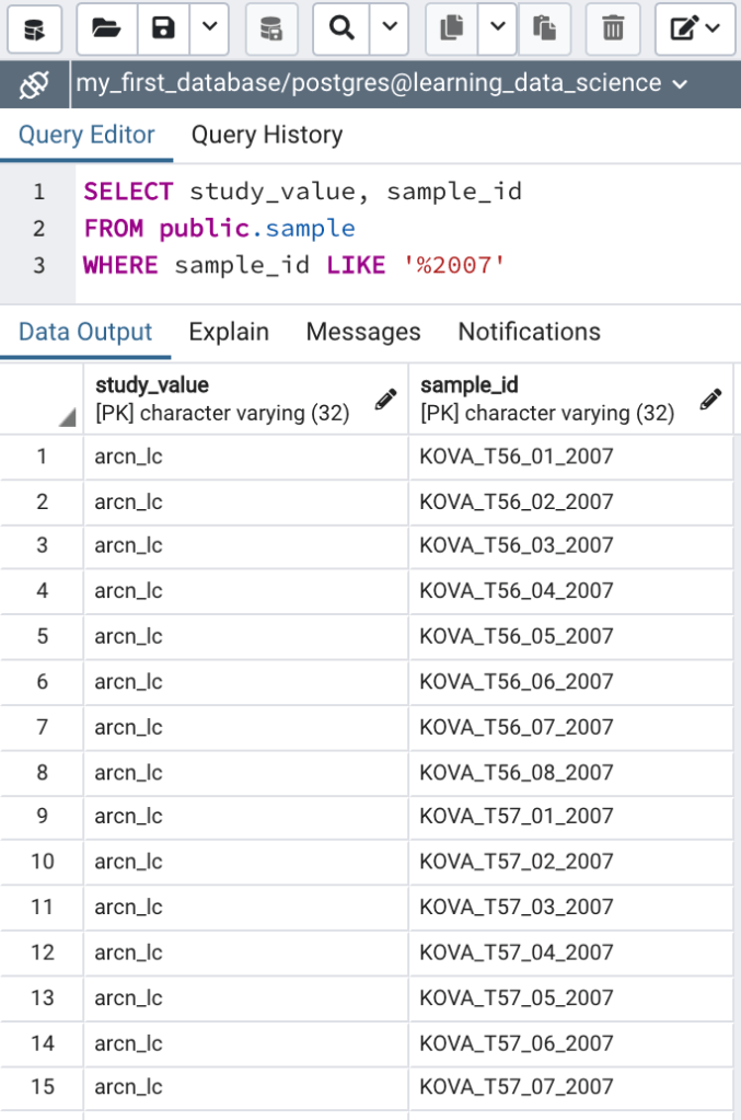 The above select statement will return all rows where the value in the sample_id field starts with GAAR followed by zero or more characters (Figure 4A). Placing the percent sign before the literal characters will return all rows with the literal characters at the end of the string. For instance, the following select statement will return rows that end with 2007 and are preceded by zero or more characters (Figure 4B).