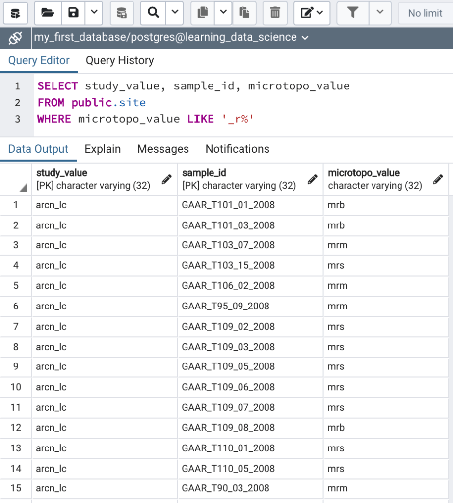 For example, the following select statement returns all columns and only those rows from the public.site table where the soil_restrict_layer_code column is equal to permafrost (Figure 1A).