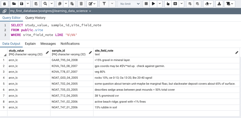 If you want to match a literal underscore or percent sign without matching other characters then the character of interest must be preceded with an escape character. The default escape character is a backslash. For example, the following select statement will find only those rows in the public.site table where the site_field_note column contains a percent sign (Figure 5C):