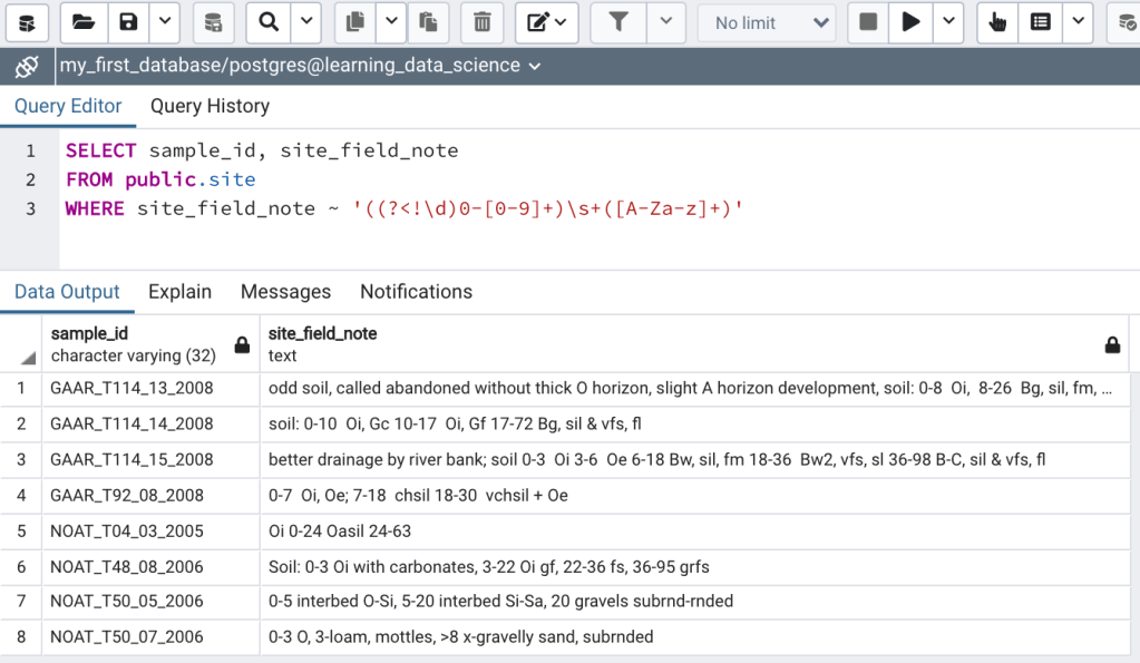 Here’s one example of using regular expressions. The following query will select all rows in which the site_field_note column contains a stand alone zero (0) followed by one or more numbers between zero and 9, followed by one or more spaces, followed by one or more upper or lower case letters. When using regular expressions with WHERE the tilde character (~) is placed between the column name and regular expression and is approximately equivalent to LIKE.