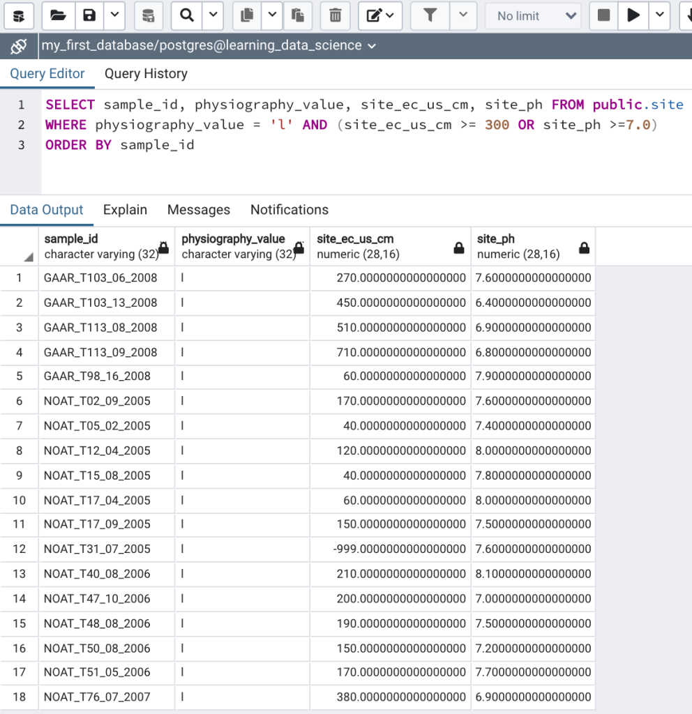 This is because in the first statement the AND is processed first, and the OR is processed second. Therefore the result of the first query includes all rows where physiography_value equals ‘l’ and site_ec_us_cm is greater than or equal to 300, plus all the rows (regardless of physiography_value) with a site_ph greater than or equal to 7.0.
