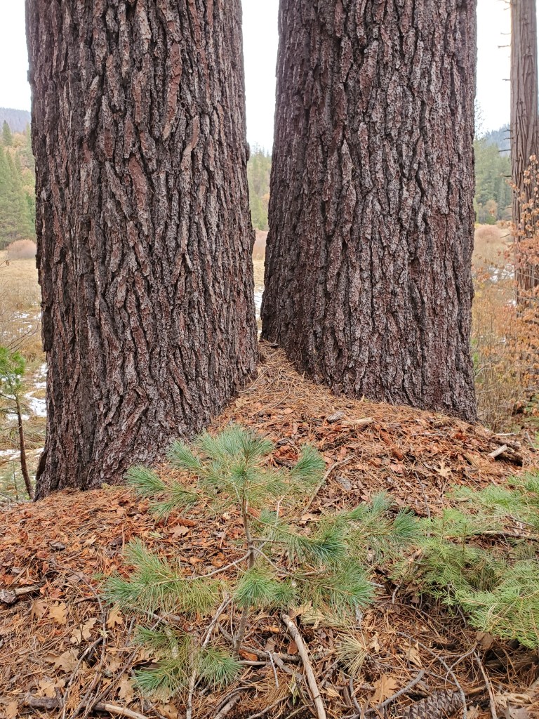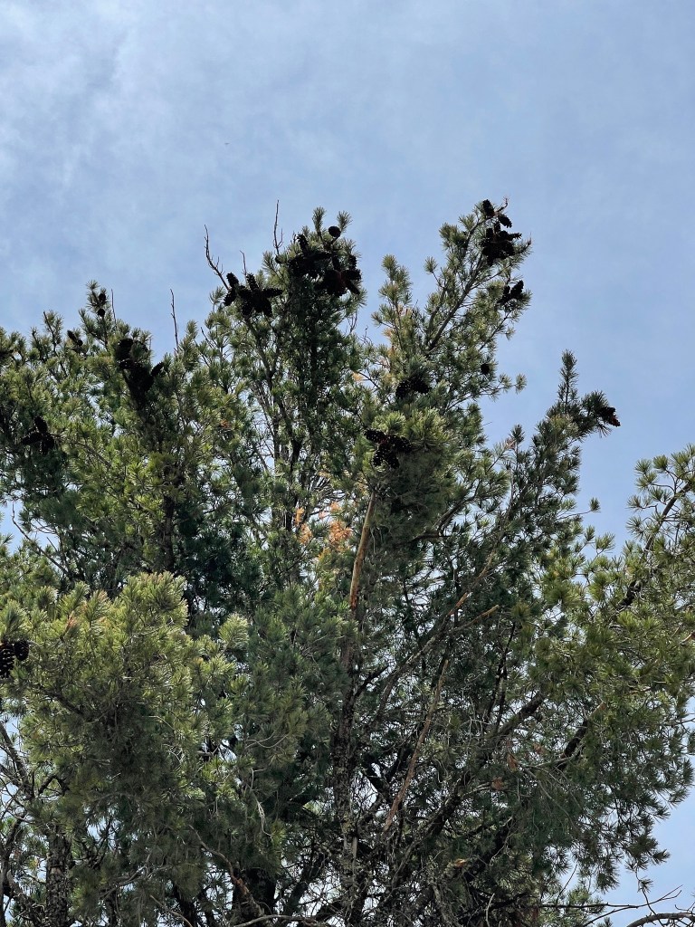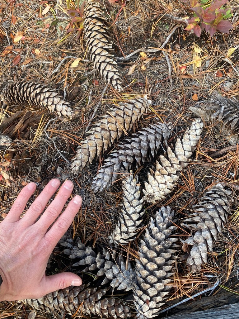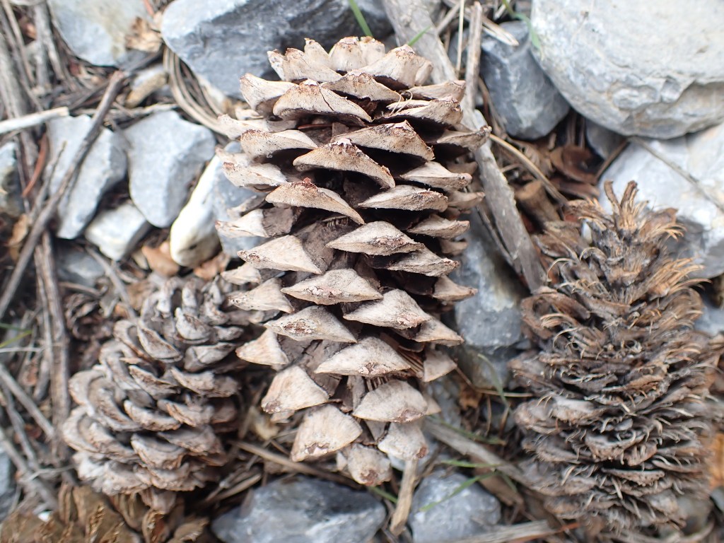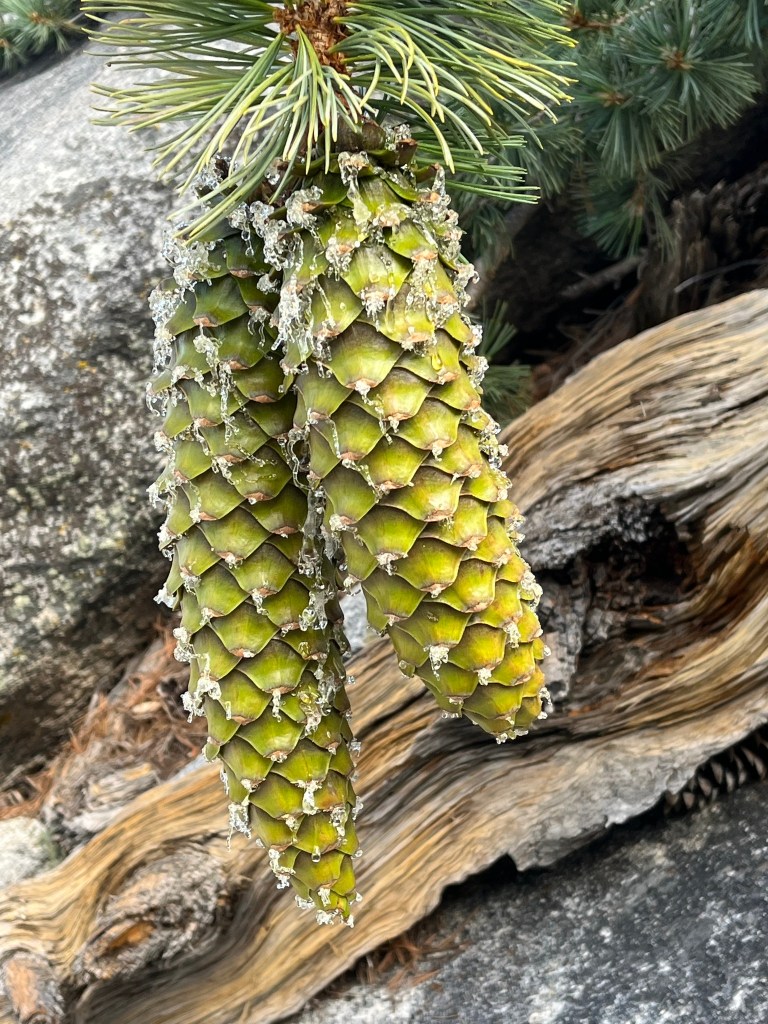 Also, the persistence of the seed cone scales differs between the 2 species. Limber pine has persistent, spreading scales, whereas the seed cone scales of whitebark pine are non-persistent, having thin bases that are easily broken off by seed predators. A general rule of thumb is, that if you are attempting to distinguish between these 2 species in the field, if you readily see intact seed cones at the base of a mature tree, then it’s likely to be limber pine. If you don’t readily seed intact seed cones under the tree, or instead find only cone parts (e.g., cone scales), then it’s likely whitebark pine. See the photos below for examples of whitebark pine.