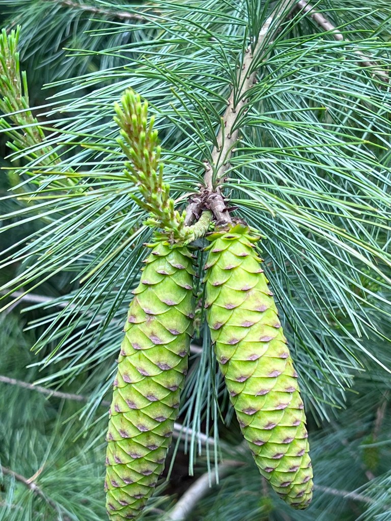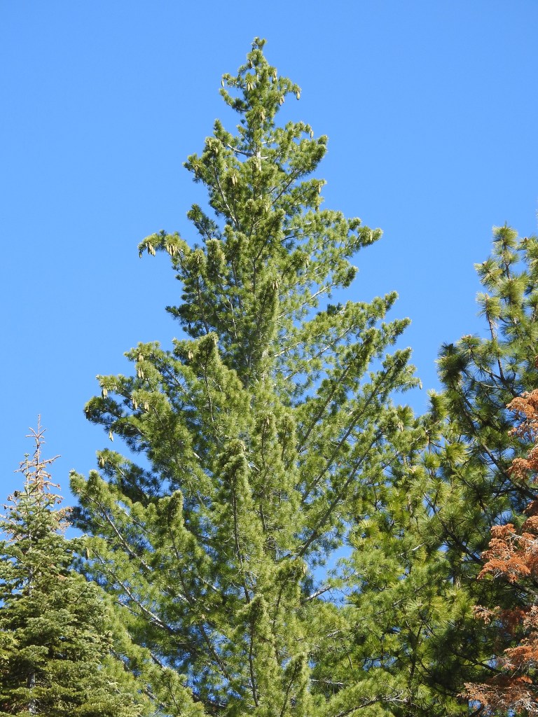 Tips for Identification of Sugar Pine: This species can grow to 75 m (246 m) tall and typically has a straight stem, and a narrow, cone-shaped crown. The upper branches of mature seed code bearing trees are often bending downward under the weight of the cones which, when nearing maturity, can weigh 1–2 kg (~2–4 lbs) each. Mature seed cones have persistent scales and terminal umbos, and are >25 cm (10 in) long. Sugar pine is similar to western white pine (P. monticola). The primary difference between the 2 being the length of mature seed cones; 15–25 cm (6–10 in) for western white pine and >25 cm for sugar pine. Also, the geographic ranges of these 2 species overlap only in California, Nevada, and Oregon.