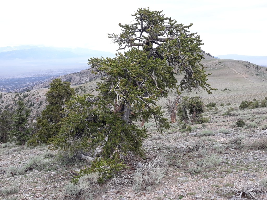 Tips for Identification of Great Basin Bristlecone Pine: Look for trees to 16 m (~52 ft) tall with trunks up to 2 m in diameter. The crowns are highly variable in growth form with low-elevation trees typically tall and upright, and high elevation trees twisted and contorted. The needles are characteristically strongly up-curved, and the branches often have bottle brush appearance. The seed cones are cylindric to round when open, 6–10cm (2.4–4 in) long, and purple aging to brown; the apophyses are much thickened, the umbo is central and armed with a slender but stiff, variable length prickle 1–6 mm (1/16–1/4 in).