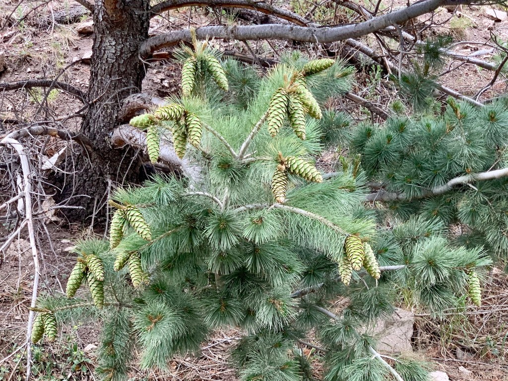 Tips for Identification of southwestern white pine: Look for tall, straight trees to 30 m (98 ft) with spreading, ascending branches. Mature seed cones have persistent scales, terminal umbos, and reflexed apophyses, and are 15–25 cm (6–10 in) long. Southwestern white pine is somewhat similar to limber pine (P. flexilis). However, the range of these 2 species overlap only in Arizona, Colorado, and New Mexico. Where they overlap the 2 species are distinguished by the apophyses of mature seed cone scales, which are recurved in southwestern white pine and not recurved in limber pine. Also the bark on the trunks of mature southwestern white pines is thick, furrowed, whereas the bark on the trunk of mature limber pines is thin, and platy.