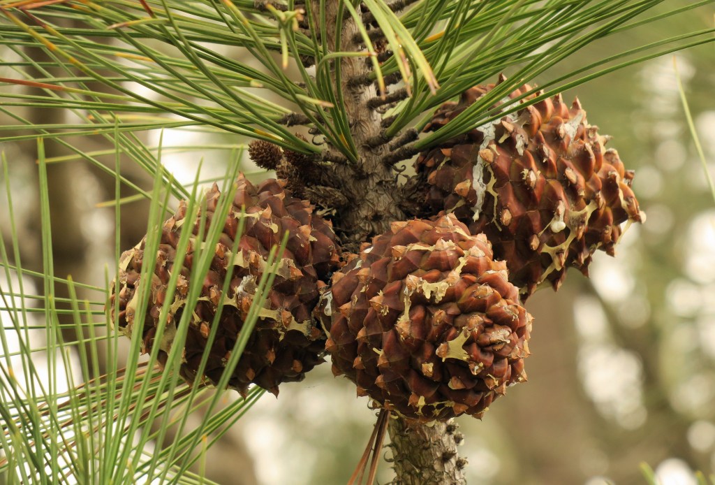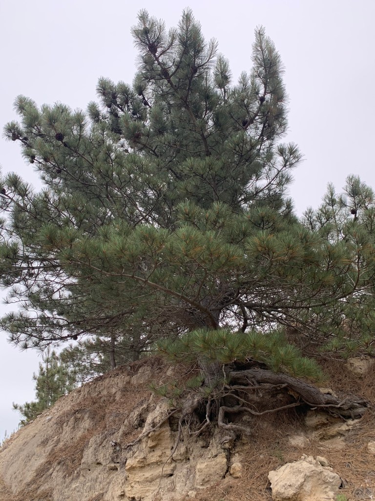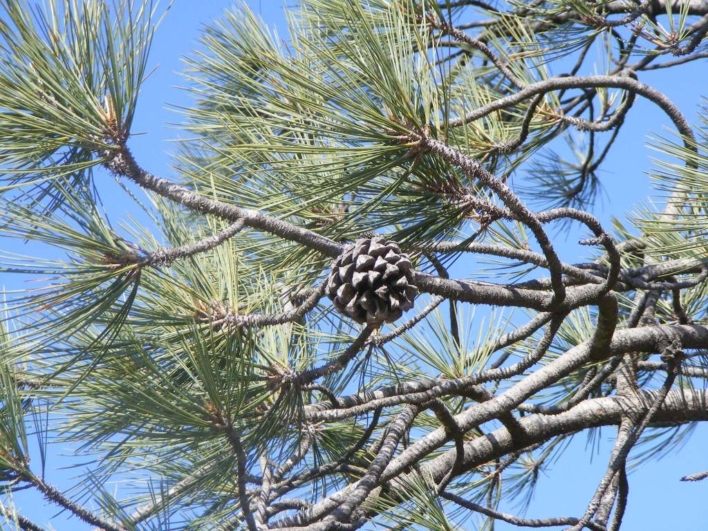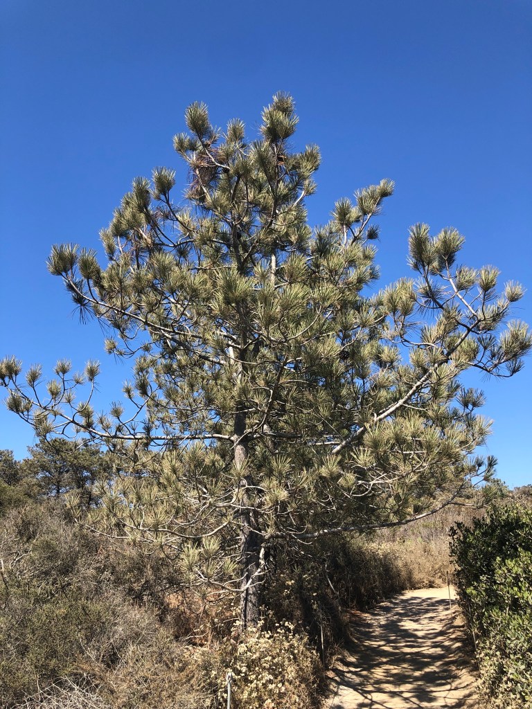 Tips for Identification of Torrey Pine: Look for relatively short trees to 15–23 m (49–75 ft ) with trunks to 1 m in diameter. As this species is typical of windswept coastal areas, the trunks are mostly crooked and leaning, and the crown shape ranges from rounded to flattened or irregular. The seed cones are large, heavy, symmetric, round, and persist on the tree for several years after maturity. The apophyses are thick and angular, and the umbo is central and forms a short, curved-tipped pyramid.