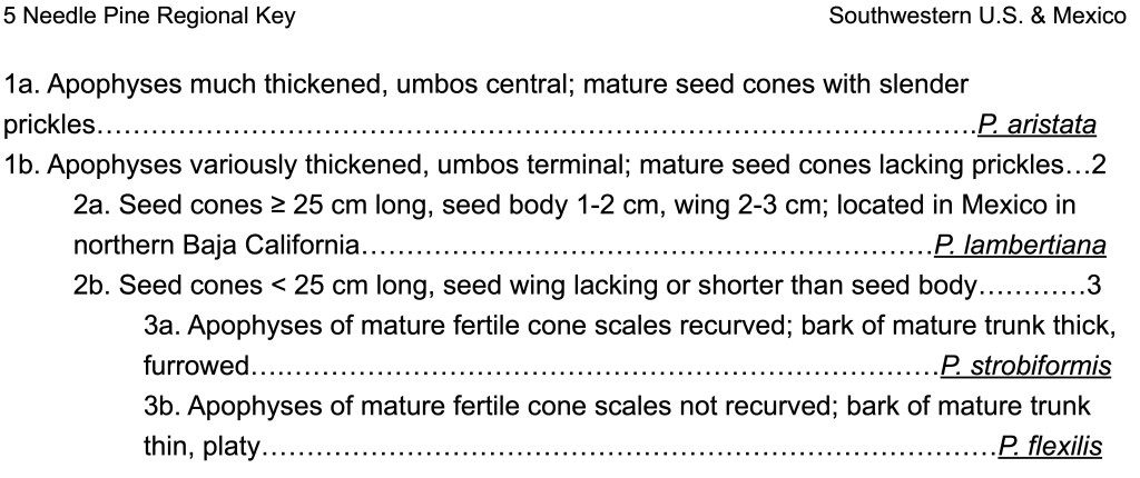 This region includes the states of Arizona, New Mexico, and Texas in the southwestern United States, and northern Mexico. Four species of 5 needle pine are known to occur in this region: Rocky Mountain Bristle Cone Pine (Pinus aristata), Limber pine (Pinus flexilis), Southwestern white pine (Pinus strobiformis), and Sugar Pine (Pinus lambertiana). A dichotomous key to the 5 needle pines of this region is provided below. Many of leads in the key follow from Kral et al. (2022). Photos of seed cones of the 5 needle pines in this region are presented below the key.